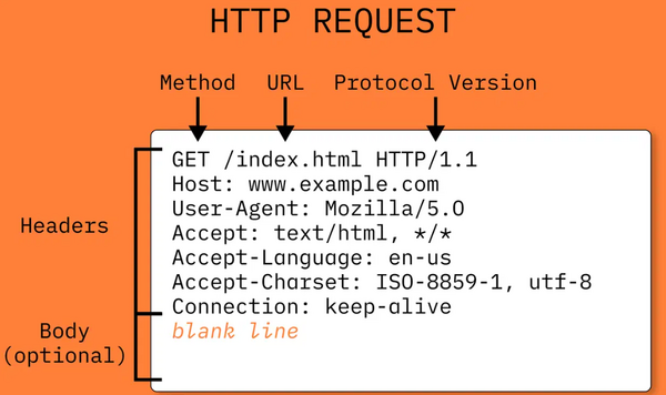 - стартовой строки - метода, url (пути запроса) и версии протокола